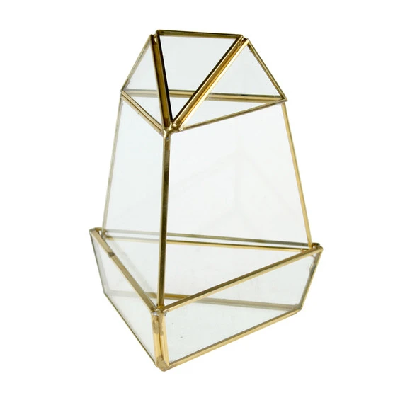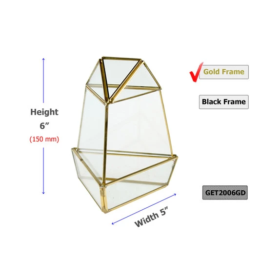 Case Pack: 9 pc/case Short Triangular Obelisk Geometric Glass Terrarium Gold Frame Width Approx: 4″, Height: 6″, Type: Glass Condition: New 2 pieces: The top section can separate from the bottom. Item does not come with any plants or accessories. Water may seep through edges. This listing is for one set only.