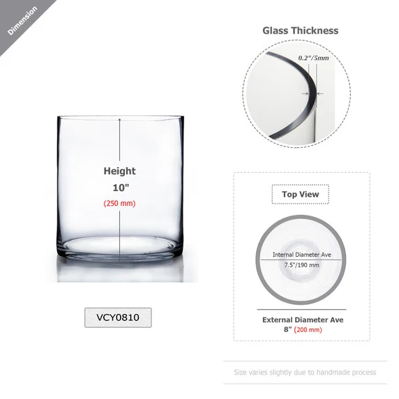 Presenting our exquisite 8-inch wide cylinder glass vase collection, a symphony of elegance and versatility, available in a range of heights spanning from 4 inches to a graceful 28 inches. Each vase is a masterpiece of meticulous craftsmanship, designed to seamlessly merge with your artistic vision and enhance the beauty of your surroundings.
