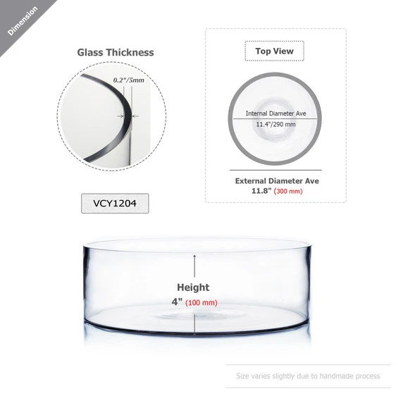 Introducing our exquisite collection of 12-inch wide glass cylinder vases, thoughtfully curated in three unique sizes to perfectly complement your artistic vision. With heights spanning from a dainty 4 inches to an elegant 12 inches, these vases offer an exceptional platform to bring your creative ideas to life.