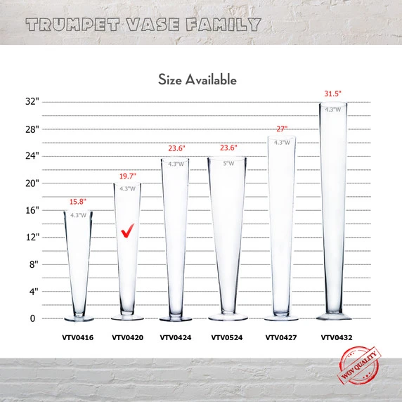With heights ranging from 16 to 36 inches, our Trumpet Glass Vases offer a graceful and commanding presence. Whether you’re aiming for a subtle touch or a grand statement, these vases cater to your needs with their varied dimensions. The range allows you to play with height and composition, enabling you to curate visually captivating displays that draw attention and admiration.