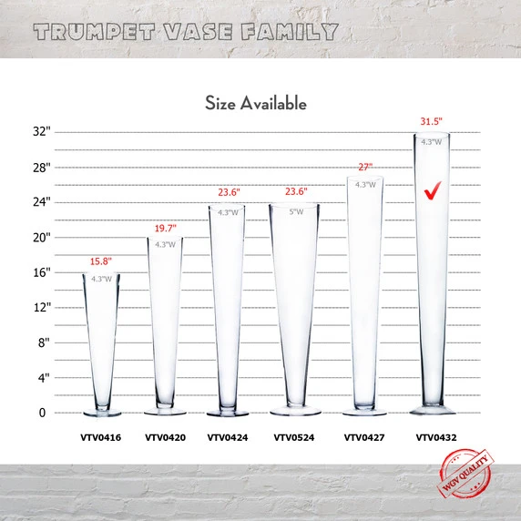 With heights ranging from 16 to 36 inches, our Trumpet Glass Vases offer a graceful and commanding presence. Whether you’re aiming for a subtle touch or a grand statement, these vases cater to your needs with their varied dimensions. The range allows you to play with height and composition, enabling you to curate visually captivating displays that draw attention and admiration.